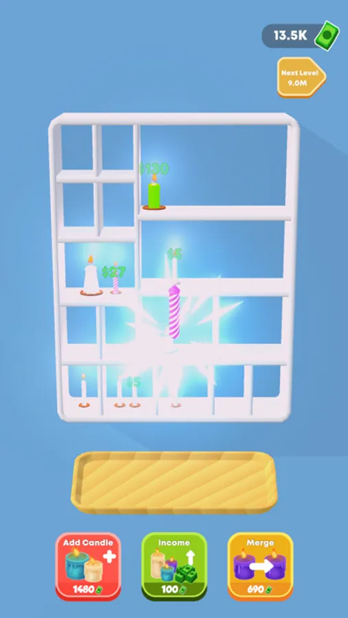 Merge Strategy: Be careful as you merge. You can merge candles, no matter how much they've been burned. The more you wait, the more money you'll get at each merge level—but you can merge directly to earn cash faster!