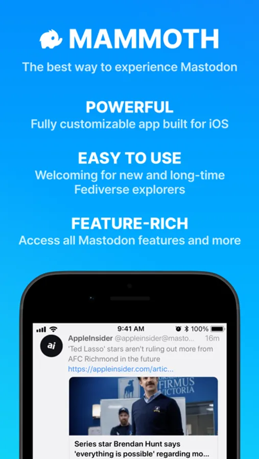 Mammoth is great for new and long-time users alike. Our built-in simple onboarding tool helps you get started with Mastodon, including setting up your account. Our extensive feature set makes it the go-to app for all your Mastodon needs. Siri Shortcuts and Share Extensions also means that the fun doesn’t stop when you leave the app.