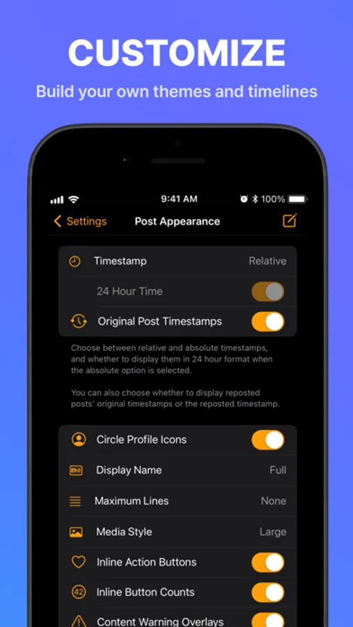 - Customize the app exactly how you want: change the color theme, the app icons, how posts are displayed, and much more!