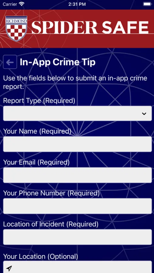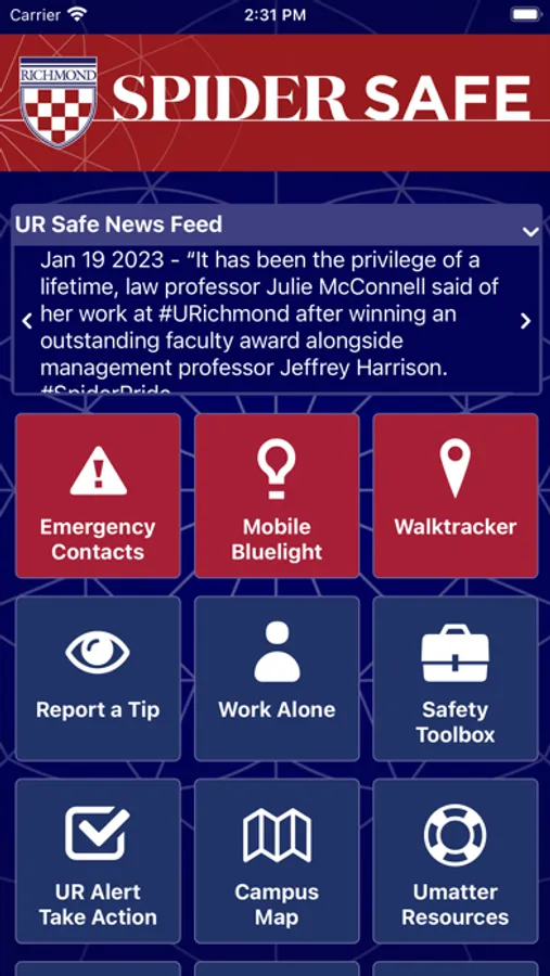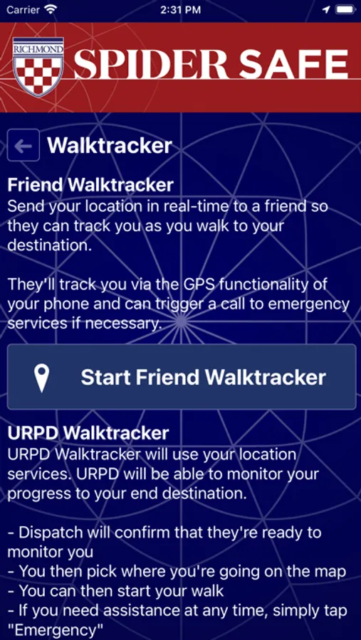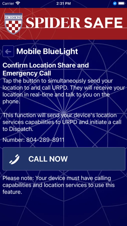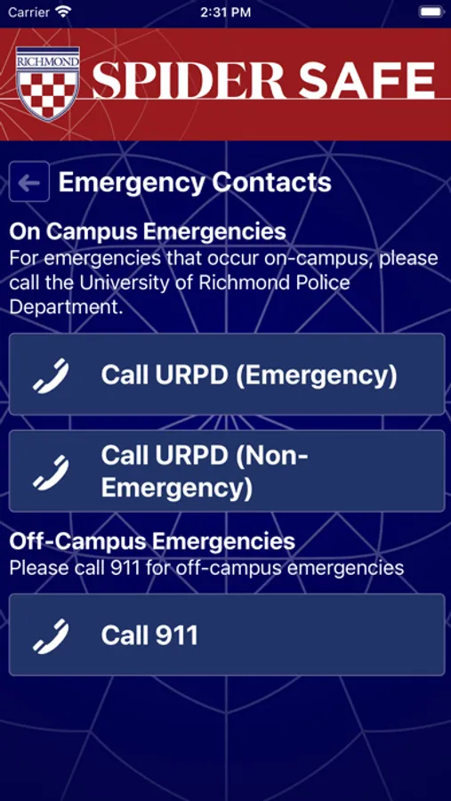 SPIDER SAFE is the official safety app of University of Richmond. It is the only app that integrates with University of Richmond's safety and security systems. URPD has worked to develop a unique app that provides students, faculty and staff with added safety on the University of Richmond campus. The app will send you important safety alerts and provide instant access to campus safety resources.
