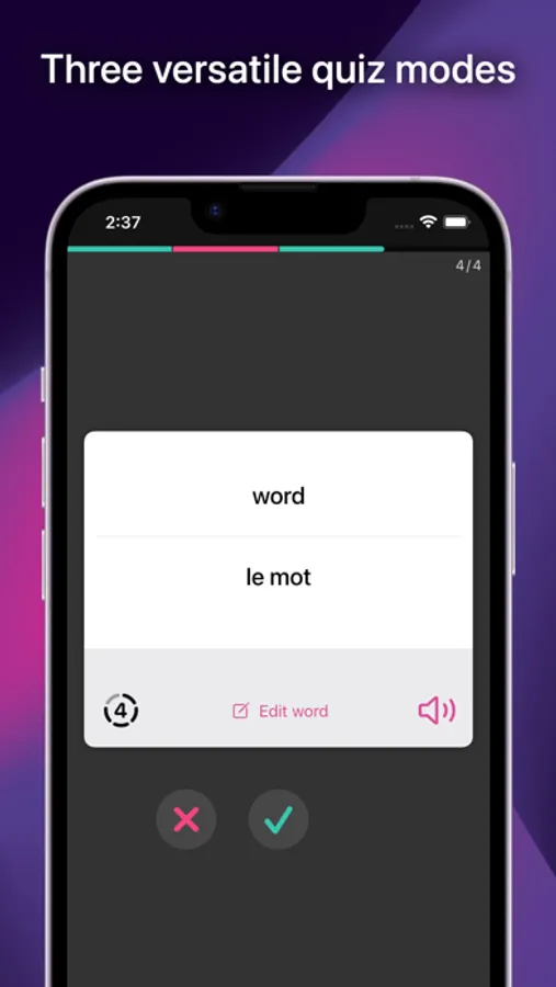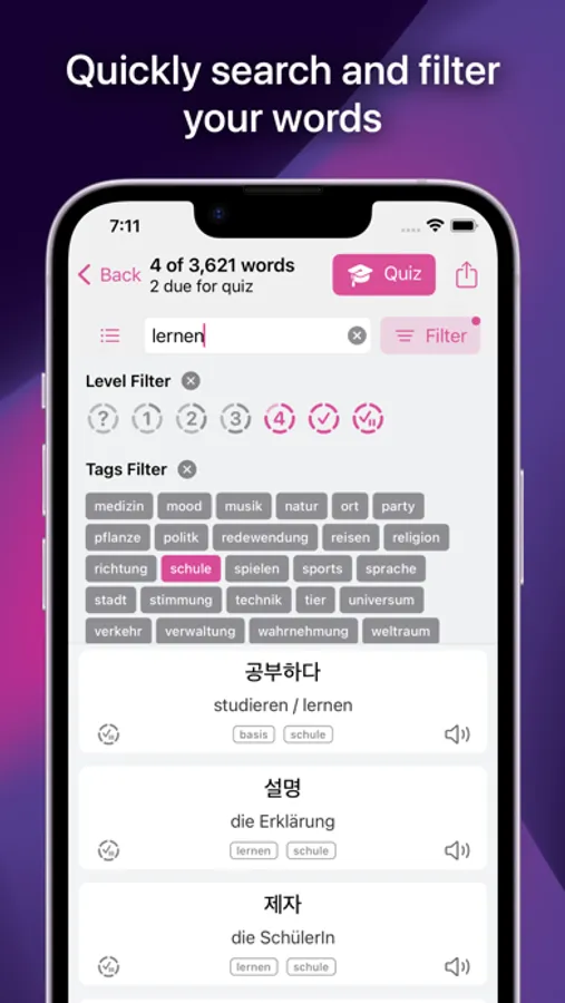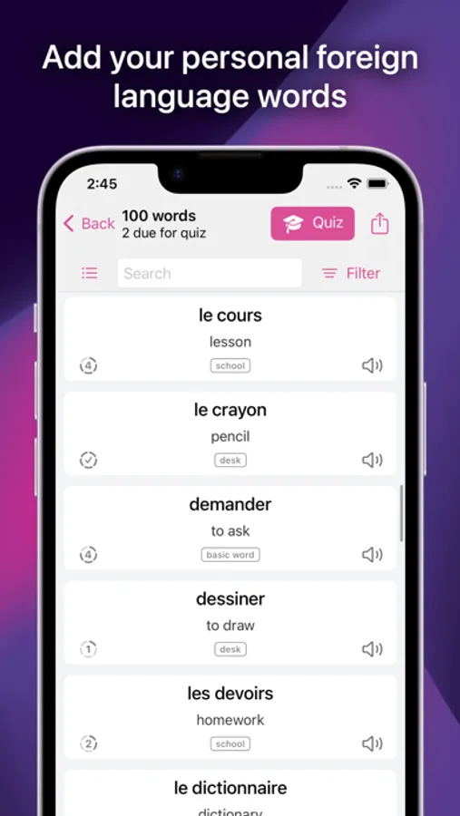 • Flash card quiz: Learn and repeat your words.