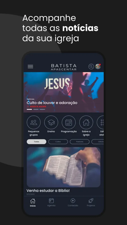 Recursos disponíveis no Aplicativo: Notícias, Agenda da igreja, Eventos, Conteúdos, Projetos, Transmissão ao Vivo e Módulo Ensino.