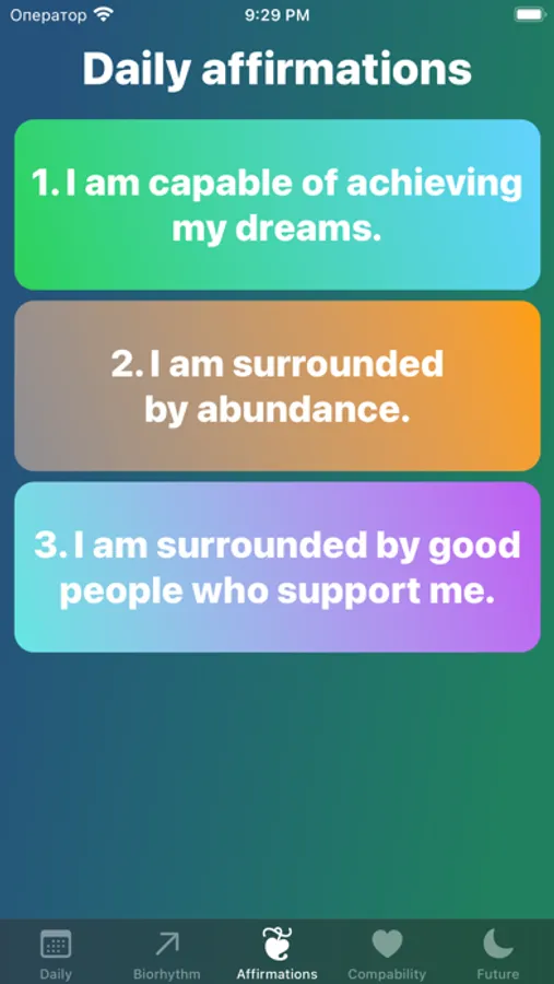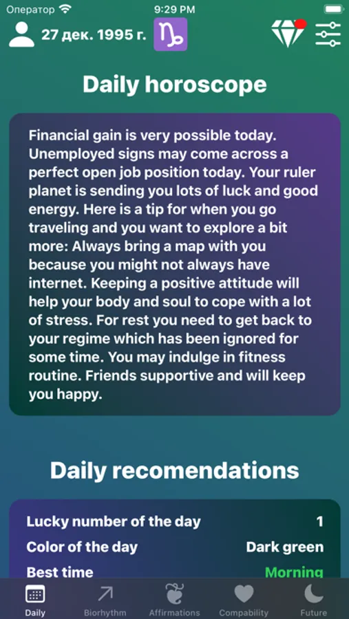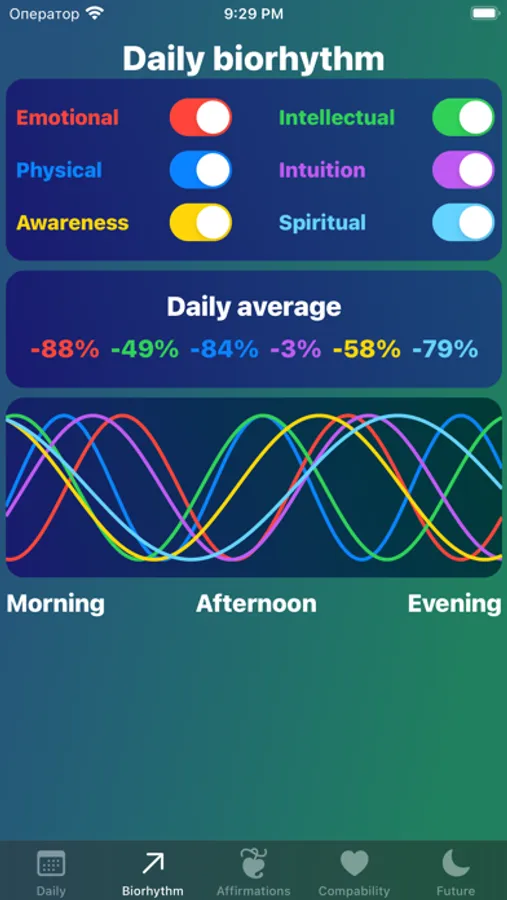 Affirmations are powerful tools for personal growth and our app offers a variety of positive affirmations to help you start your day off on the right foot. Our Biorhythm feature provides you with an analysis of your physical, emotional and intellectual cycles, helping you understand when you may be feeling at your best or when you may need a bit more rest.