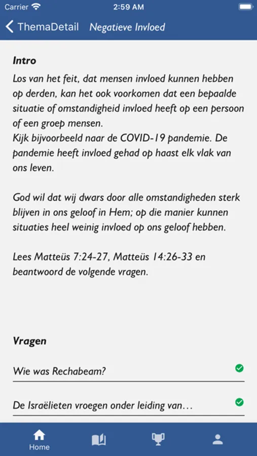 Met de Scripture Engagement App kun jij je bijbel kennis toetsen op verschillende thema’s, speciaal geselecteerd voor jou bestemd als digitale bijbel in jou zak. Ben je er ready voor?