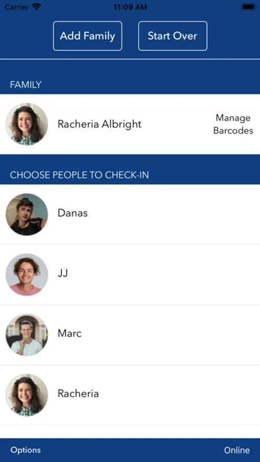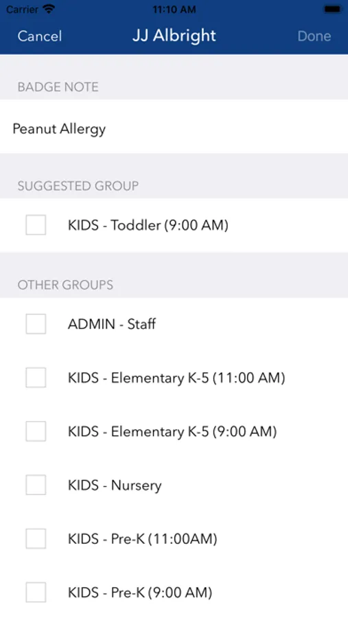 You can choose the group to check each child into, add new children and families, and edit the notes that print on the badges.