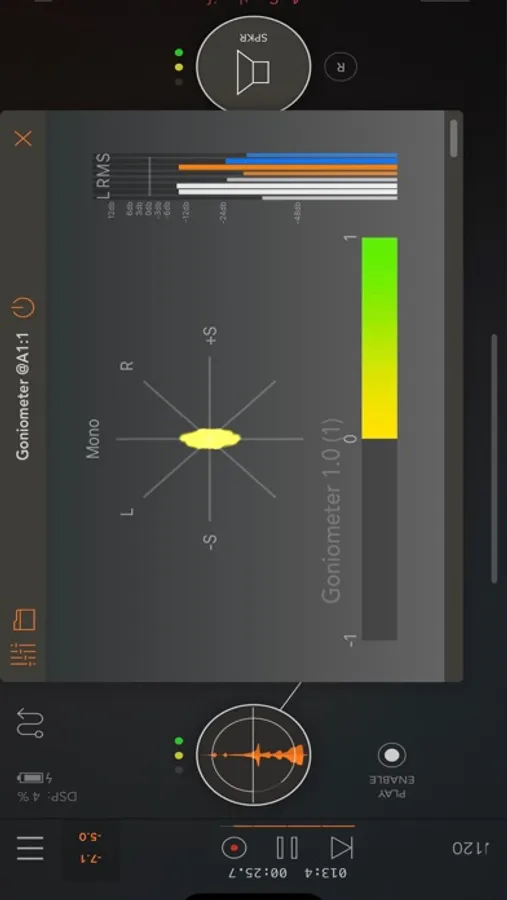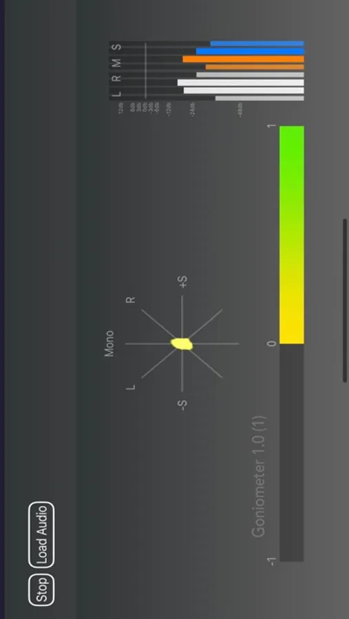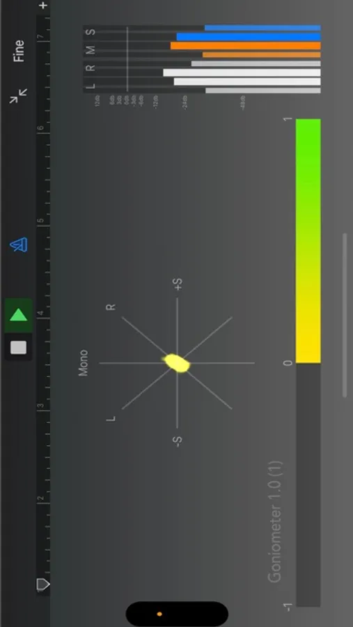 An audio goniometer is a tool used to measure and analyze the stereo image of a sound recording. It typically allows the user to switch between Mid-Side (MS) and Left-Right (LR) channels, and can display the relative levels and phase relationships between them.