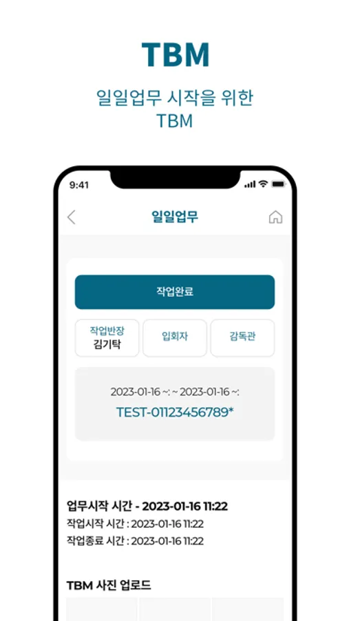 작업 시작 시 TBM사진∙작업 전 사진을 촬영 후 업무 시작 버튼을 눌러 업무를 시작하세요.