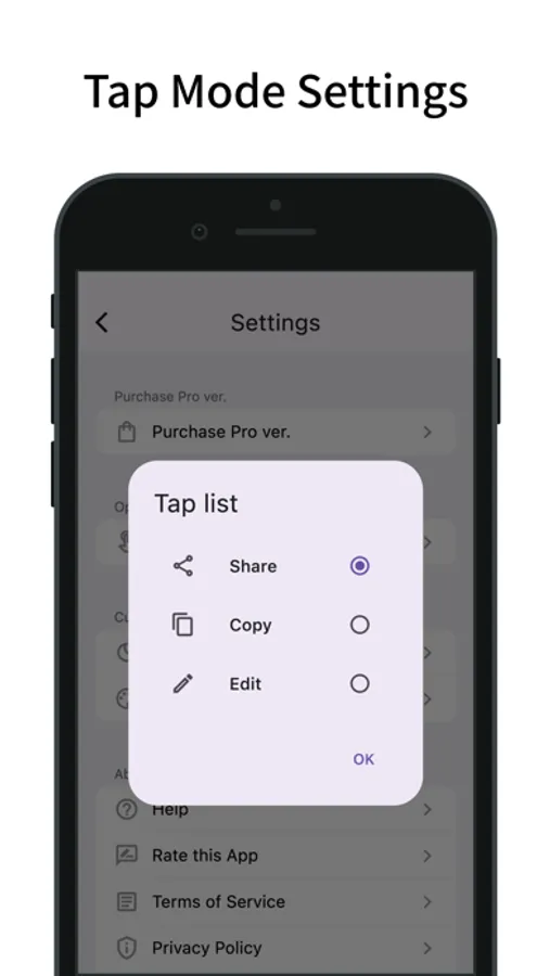 Tap operation can be changed from Settings (Share, Copy, Edit).