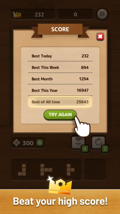Strategically place wooden blocks on the board to clear space and earn points, but beware, if you run out of free space it’s game over!