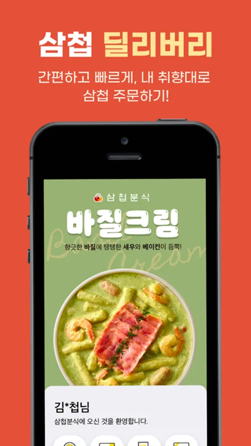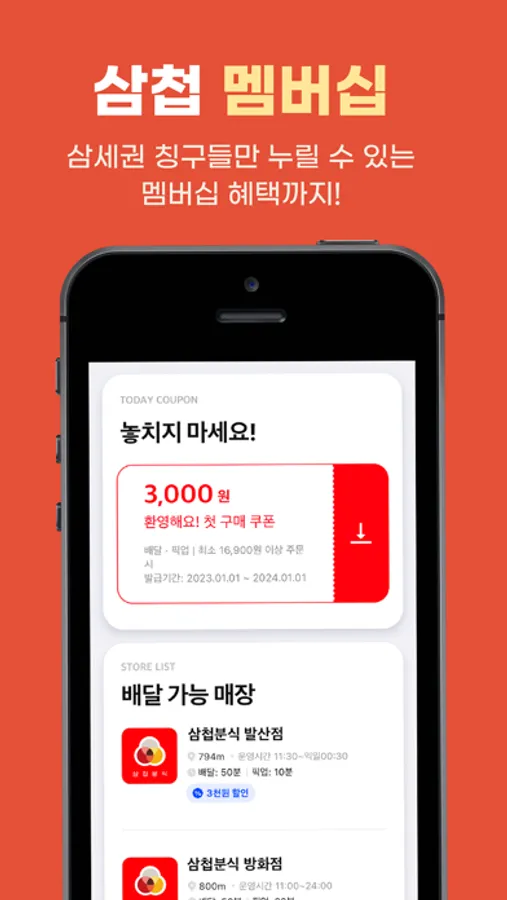 삼첩분식 앱에 가입하시면 더욱 간편하고 빠르게 배달 및 포장 서비스를 즐길 수 있습니다. 더하여 삼세권 칭구들만 누릴 수 있는 멤버십 혜택까지!