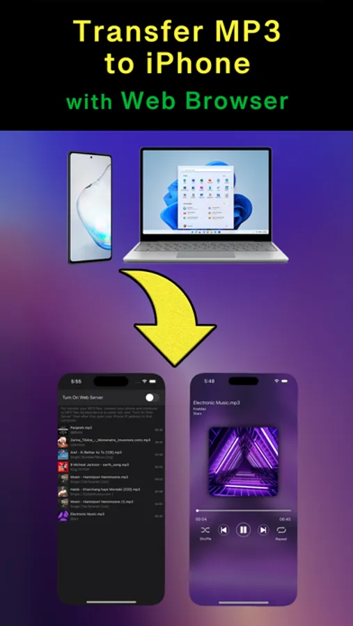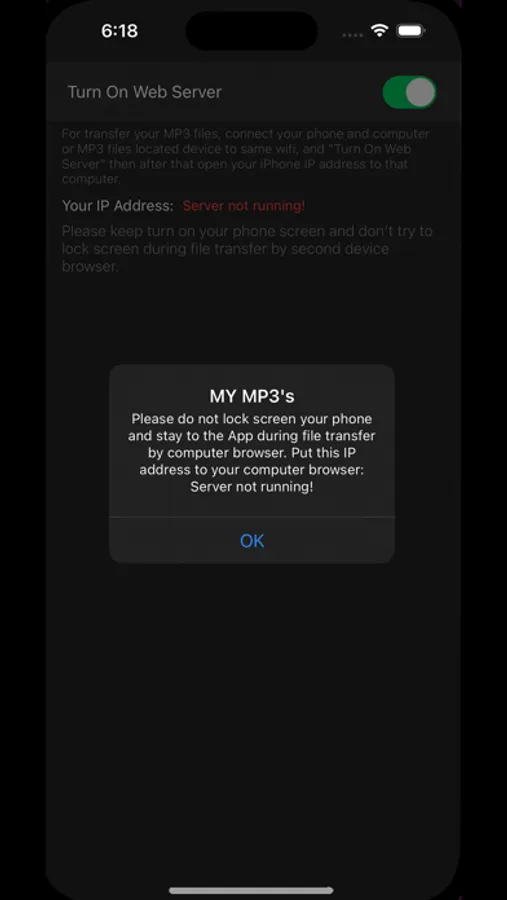 For using the application you have to connect to same WiFi your iPhone and computer device, after that from your iPhone you have to "Turn On Web Server" and as you see in screenshot, you have to put your iPhone IP address to "Web Browser" of your computer or another phone, then you can select drag your MP3's to web browser, so! done!