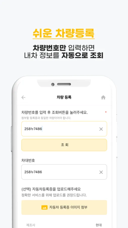 차 번호만 입력하면 간편한 차량 등록차량번호만 입력하시면 내차 정보가 한번에 입력되어 여러대를 보유하셔도 등록이 간편합니다.
