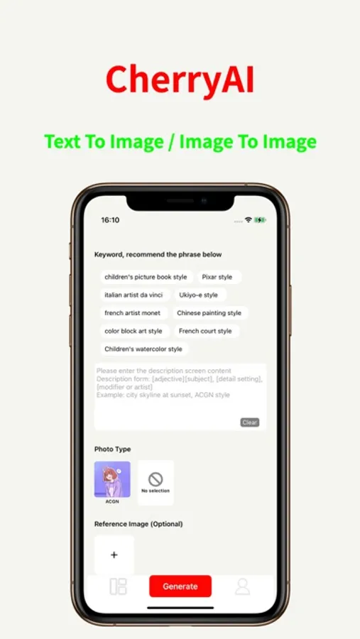 Choose your photo, describe or check the style you want, CherryAI can help you generate