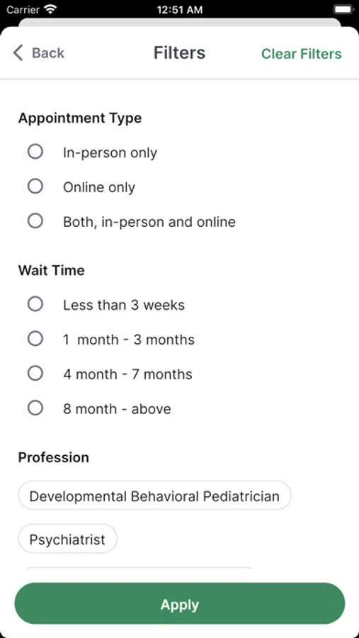 Once a subscription plan is purchased, you have access to the provider network that includes speech therapy, occupational therapy, physical therapy, ABA therapy, counseling, Developmental Behavioral Pediatrics, Psychiatry, Psychology, and more. Filter through providers based on profession, expertise, location, payment options, and wait time. This helps families target the services they need more seamlessly and efficiently. Subscription plans are offered monthly, quarterly, and yearly and can be canceled at any time.