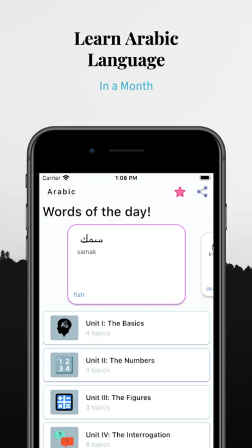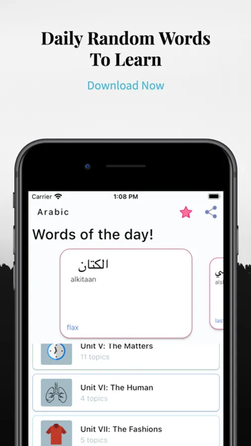 Our app lets you learn Arabic language from basics to advance level. There is a large database collection of useful Arabic words and phrases available offline in the app. You can can go through different topics and learn essential Arabic words. Also you can learn random useful words from the app updates on daily basis.
