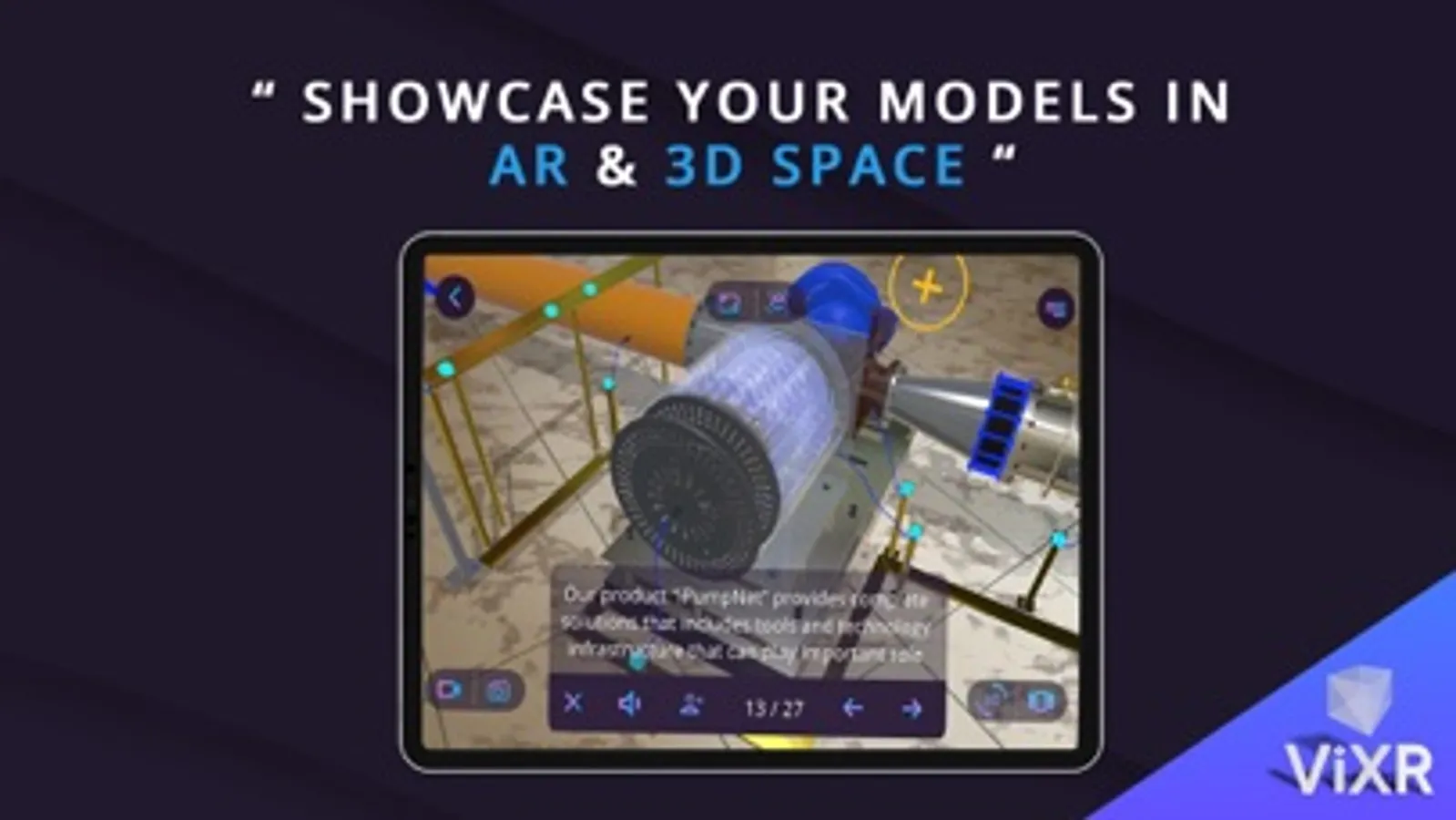 ViXR Wonder creates a private AR presentation for you and your clients, where you can showcase your products and services. Simply initiate a meeting from within the application, and present your product to your clients on the go.