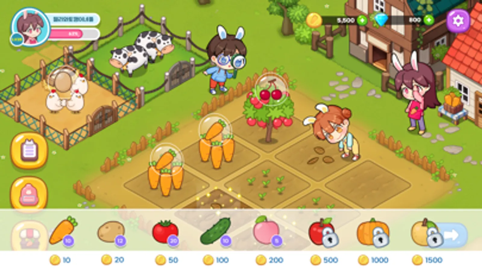 Harvest ripe and nutritious vegetables, such as carrots, cucumbers, potatoes, and pumpkins, from your farm. You can efficiently plant a range of vegetables by selecting them from the menu and dragging them to the desired location. Harvest multiple vegetables of the same type with a single touch for greater efficiency.