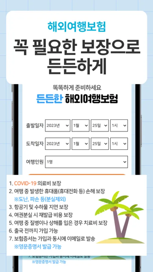 2023년도에도 여행을 떠나는 모든 분들에게 필요한 여행자 보험을 투어밸리 앱이 모두 정리해 두었습니다. 단기 여행, 장기 여행, 단체 여행자 보험까지 모두 모바일에서 간편하게 확인해 보세요!