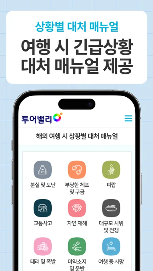 분실 및 도난, 부당한 체포 및 구금 등 해외에서 발생할 수 있는 비상상황에 대한 매뉴얼을 제공하여 보다 더 안전한 여행을 도와드리고 있습니다.