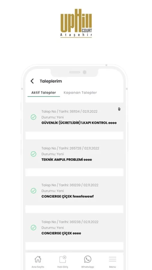 • Taleplerim; Teknik, Güvenlik, Temizlik, Bahçe Bakım vb. hizmetlerinde tespit edilen olumsuz durumların fotoğrafını çekerek iş talebi oluşturma,