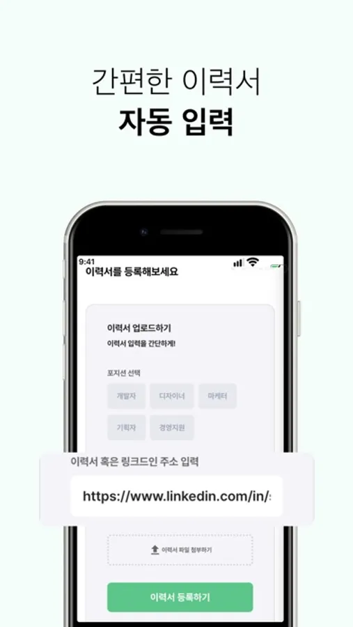 이력서를 업로드하거나 프로필 주소를 입력하면 끝.
