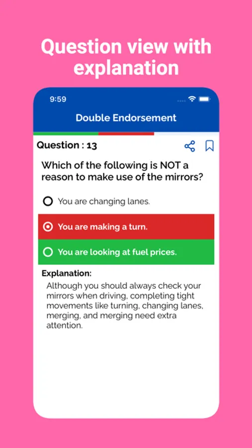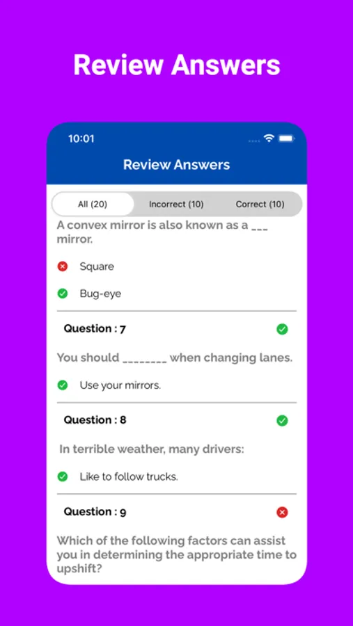 Our app includes a variety of practice questions for the Driver's license exam for Commercial Vehicles. These questions are based on the official handbook of different states.
