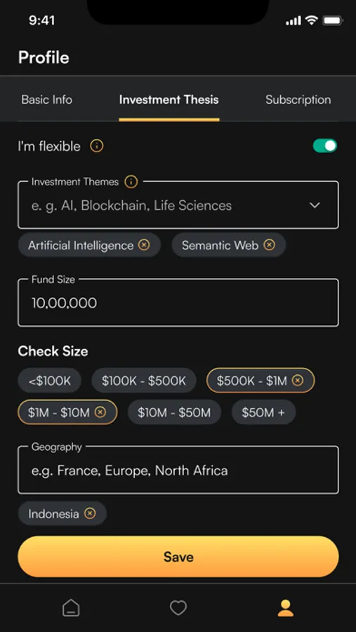 As an investor, you will be able to define an investment thesis, which will be utilized to provide you with precise matches that perfectly complement your portfolio.