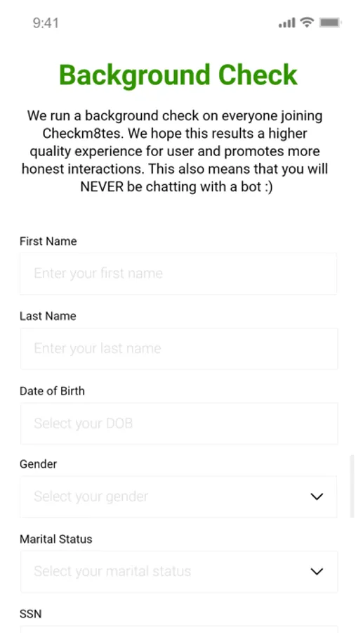 Every user on Checkm8tes is required to complete a background check upon registering. Never talk to a bot or a fraudster again.