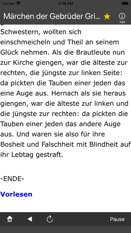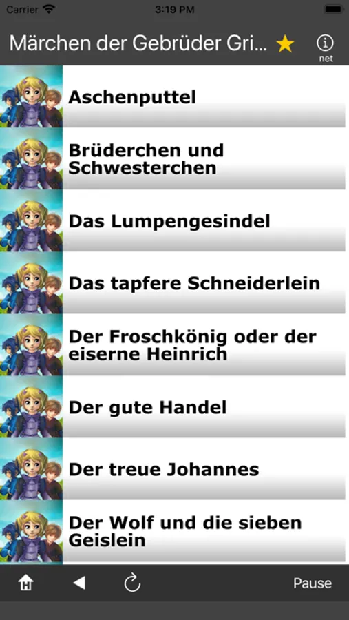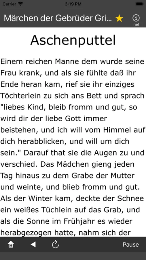 Die App zeigt Märchen der Brüder Grimm. Lesen Sie den Text Ihrem Kind vor oder aktivieren Sie die Sprachausgabe und lassen Sie vorlesen. Die Märchen sind nicht zu lang, so dass es ideal vor dem Schlafengehen geeignet ist. Die Sprachausgabe können Sie pausieren und später wieder abspielen.