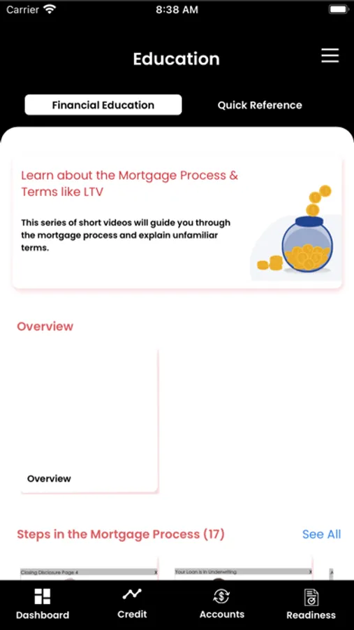 Work with your financial partner or institution to best prepare you for home ownership by planning for a down payment, establishing reserves, managing your debt to income ratio, improving or maintaining your credit, loan scenarios through our calculators, establish your projected loan to value, and more. Visit the readiness assessment in your app to see a snapshot of your credit overview, debt to income ratio, cash reserves, employment, down payment and sales price.