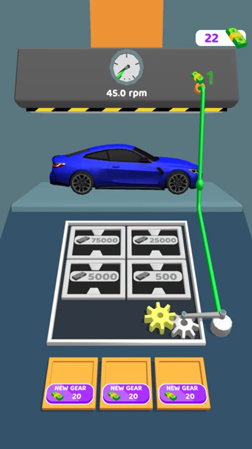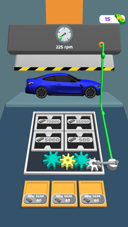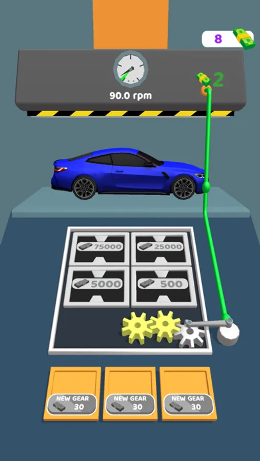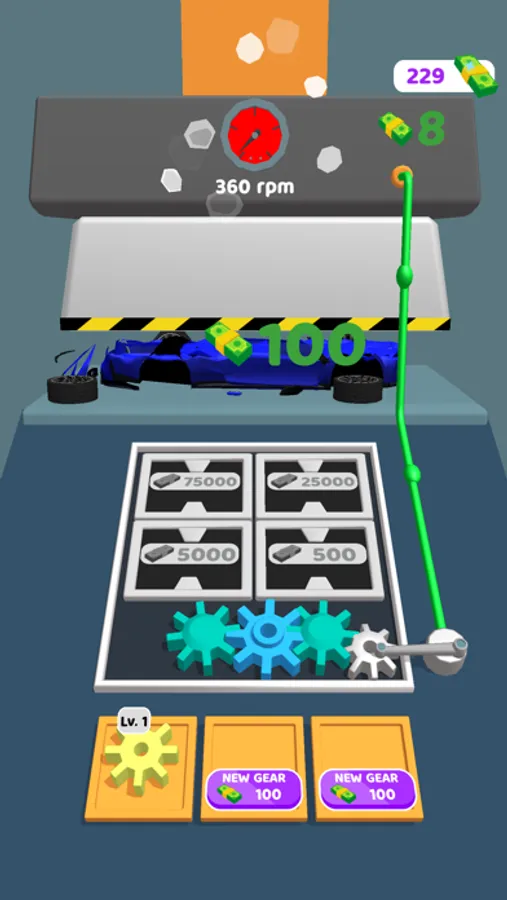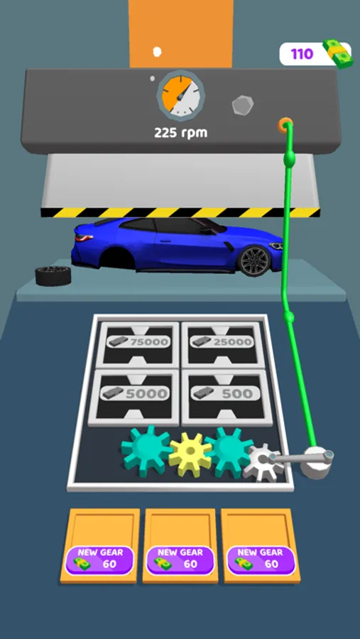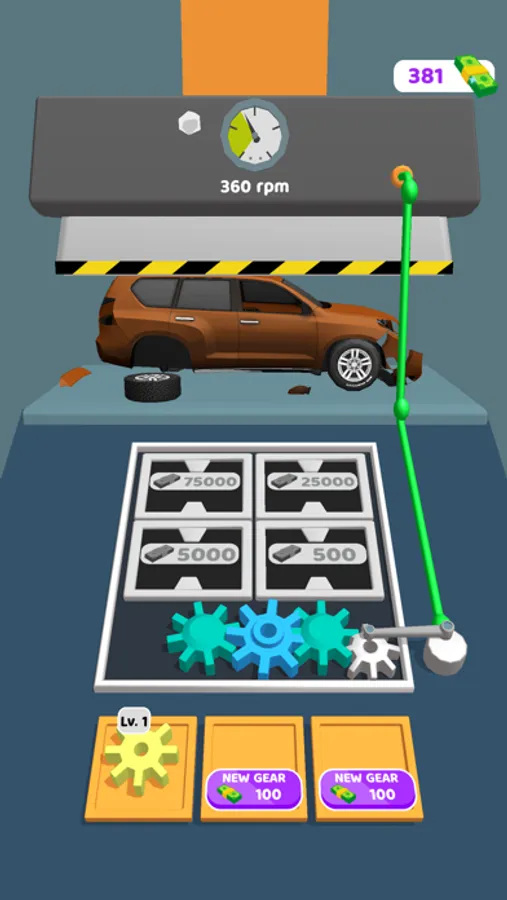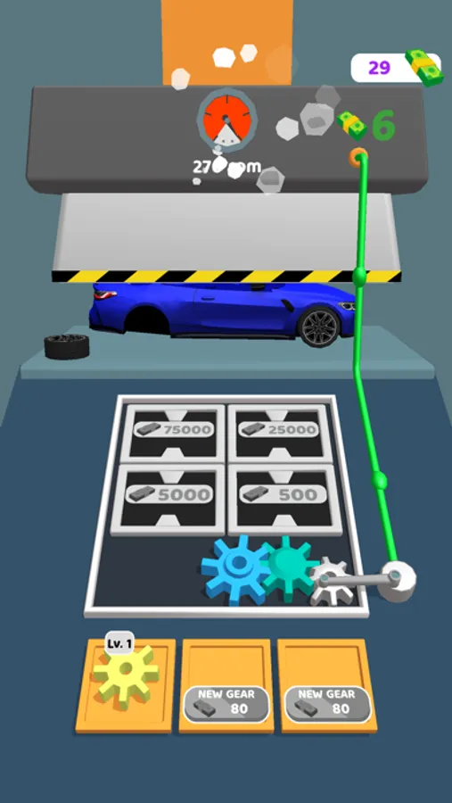 Buy more gears to make press machine work! Gears have levels so merge gears to make them stronger! Smashing cars are getting tougher every time so use gears carefully!