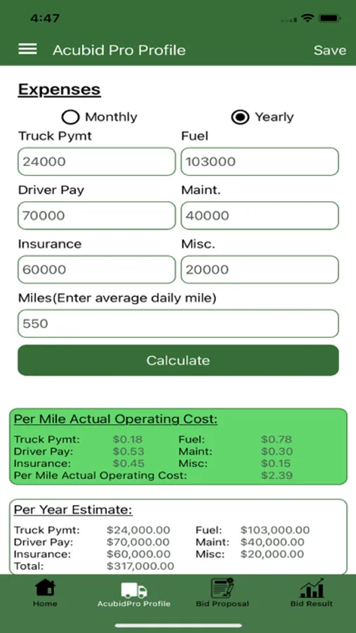 AcubidPro provides AcubidPro Profile page to calculate the Operating Cost which takes input parameters –Truck Payment, Fuel, Driver Pay, Maintenance, Insurance, Miscellaneous (IFTA, Tags, etc.), and Miles per day. Operating Cost is calculated on Monthly as well as on Yearly basis.