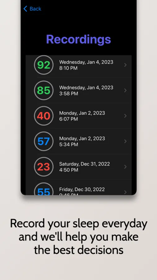 You can record your sleep before you go to bed. Recording starts immediately. Our app generates a perfect graph and calculates a sleep score based on your sleep data. The sleep score is further used to compare with your calorie intake and daily physical activities. You can make your own decision for better sleep based on the information generated by the app.