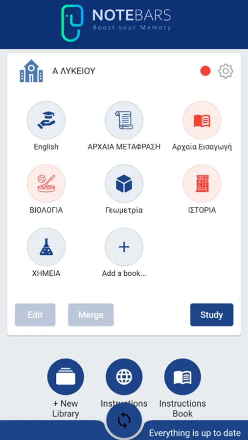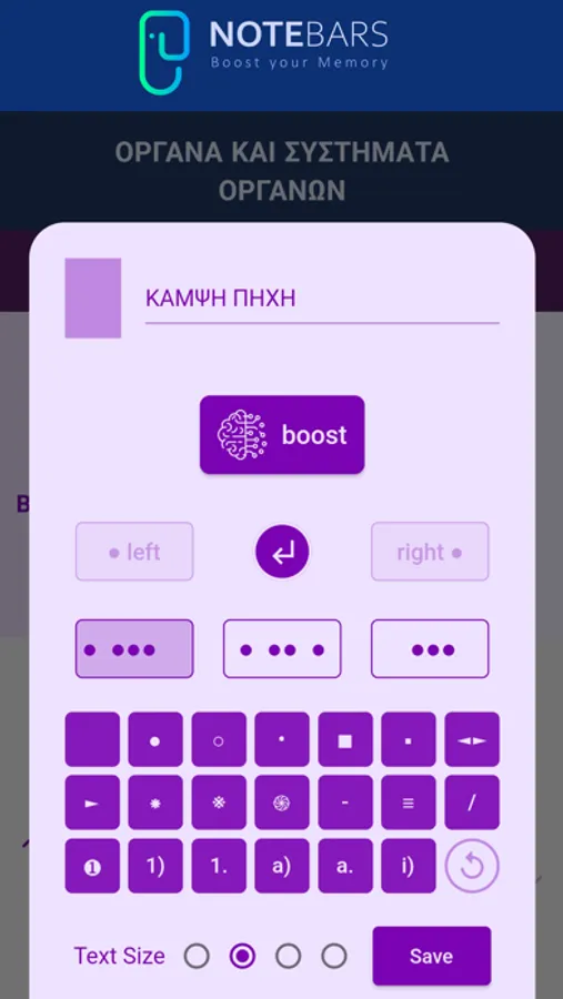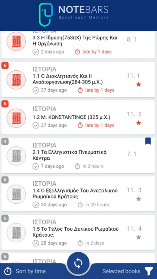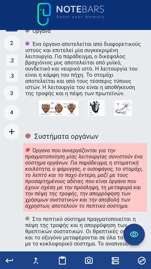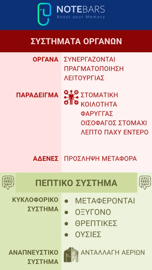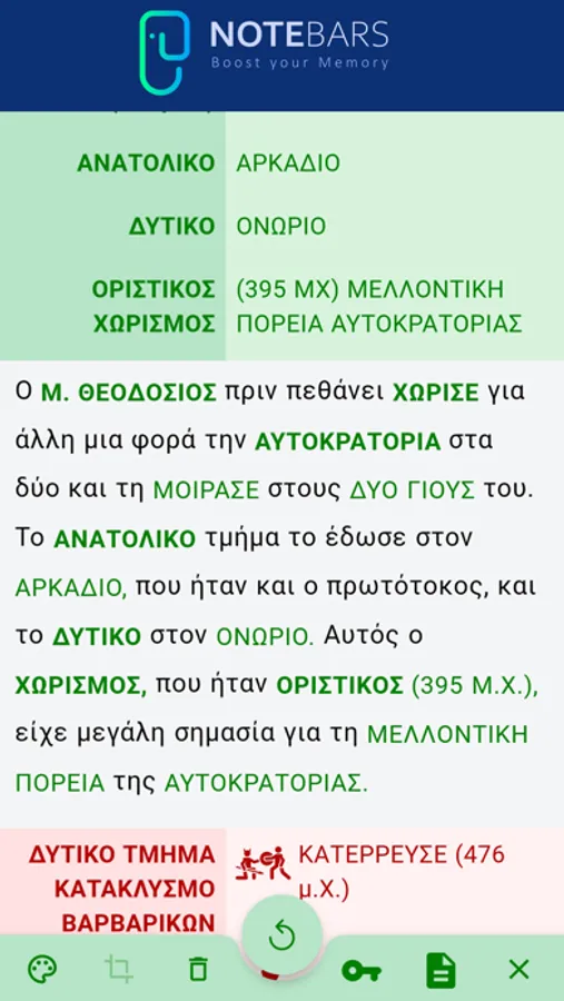Με το NOTEBARS, μετατρέπεις το κείμενο του βιβλίου σου, σε πολύχρωμες κάρτες μνήμης αποτελούμενες από notebars (μπάρες σημειώσεων). Τα notebars δημιουργούνται εύκολα, αγγίζοντας λέξεις και προτάσεις από το κείμενο καθώς διαβάζεις. Μετατρέπεις τις λέξεις σε κλειδιά μνήμης και σημειώσεις ενώ προσθέτεις φωτογραφίες και εικονίδια μνήμης. Κατά την δημιουργία σημειώσεων, με το σύστημα μελέτης NOTEBARS, κατανοείς καλύτερα την δομή του κειμένου και εντυπώνεις τις σημαντικές πληροφορίες. Χρειάζεσαι λιγότερες επαναλήψεις γιατί είναι αποδοτικές και ταυτόχρονα σύντομες!