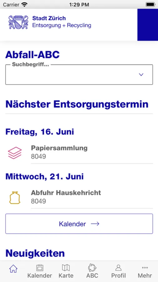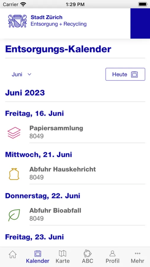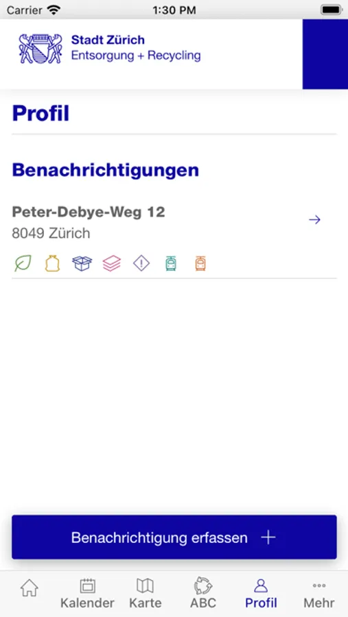 - Erinnerungsfunktion (Push-Mittteilungen oder E-Mail-Erinnerungen müssen in den Einstellungen aktiviert werden) aller Abfuhren und Sammlungen in der Stadt Zürich für beliebig viele gespeicherte Adressen: Hauskehricht, Bioabfall, Papier, Karton, Textilien, Cargo- und E-Tram