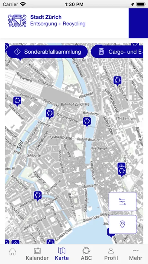 - Karte mit allen Wertstoff-Sammelstellen, Recyclinghöfen, Cargo- und E-Tram-Haltestellen sowie weiteren Standorten von Entsorgung + Recycling Zürich- Neuigkeiten, z. B. zu speziellen Entsorgungsangeboten oder Pilotprojekten - Zusatzinformationen, wie z. B. Öffnungszeiten sowie Zahlungs- und Kontaktmöglichkeiten
