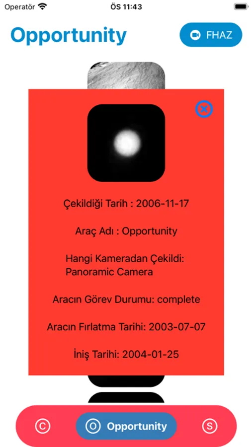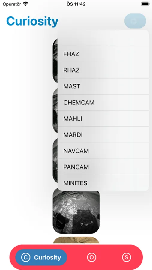 NASA API' leri aracılığıyla farklı gezicilerden görüntülerin alınıp listelendiği (sonsuz kaydırma) ve görüntüye tıklandığında farklı detayların gösterildiği, kamera tabanlı filtrelemeye sahip mobil uygulamadır. Bilgiler NASA' nın halka açık servislerinden alınmaktadır.