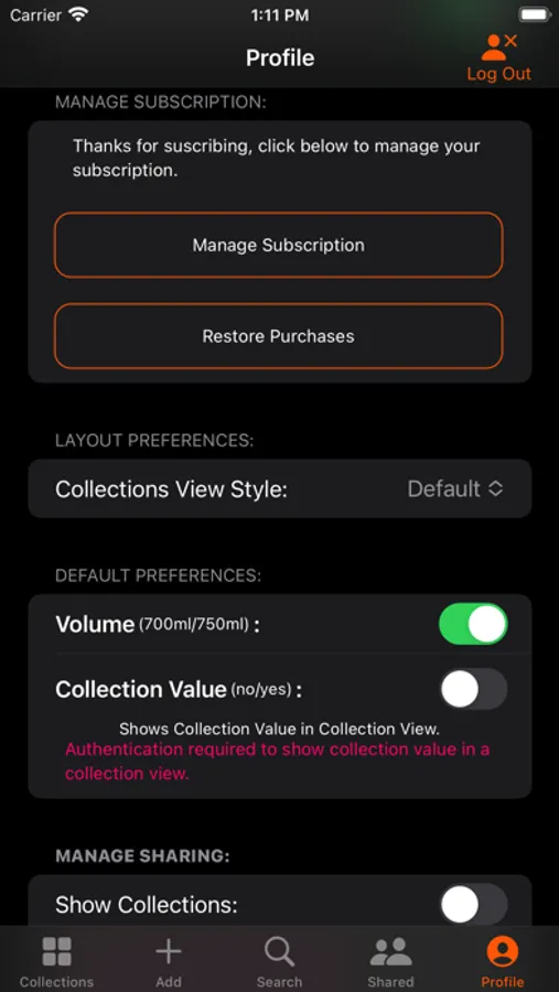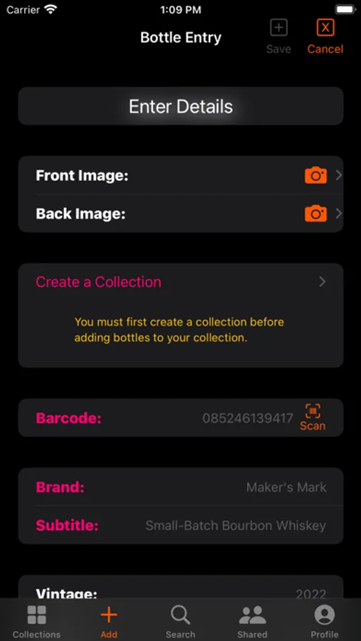 The "Collection" in WhiskeyMate is the base for performing all functions related to the collection. Collections can be named, a description can be added, and photos can be added to create a rich user experience. Once a collection has been created, bottles can be added to the collection, users can create a wish list, and the collection can be shared with friends.