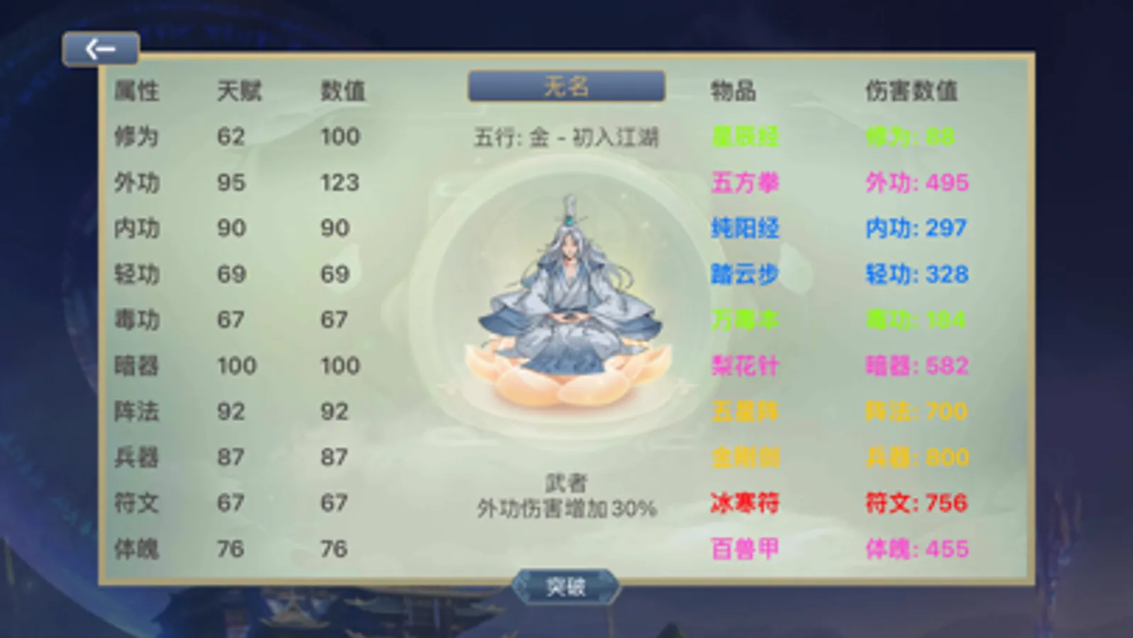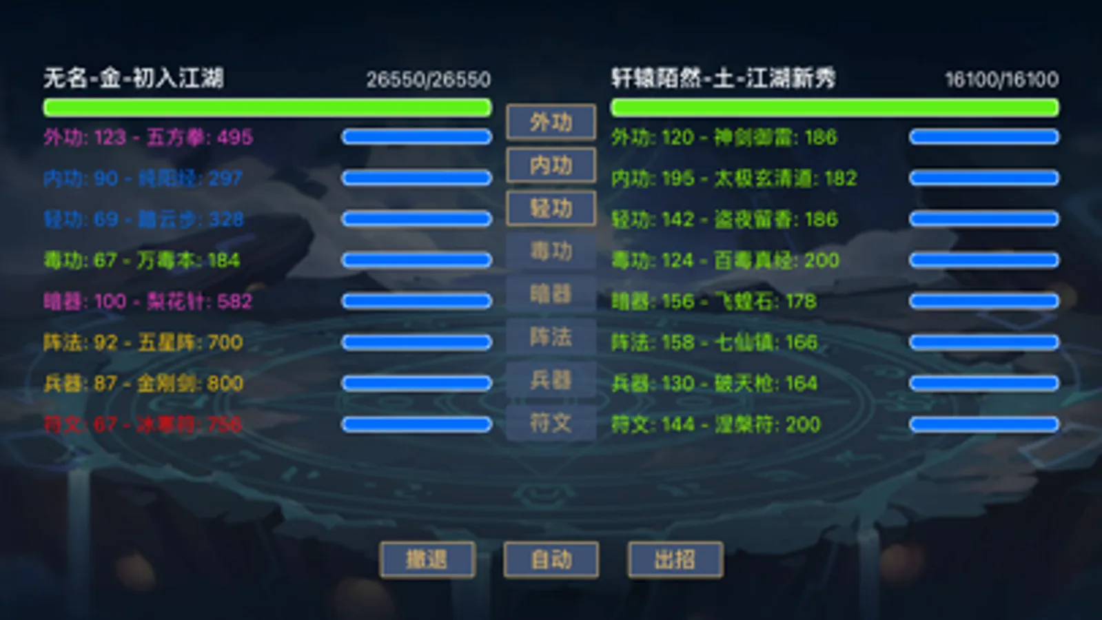 修为, 外功, 内功,轻功,毒功,暗器,阵法,兵器,符文, 体魄等多方向修行路线。