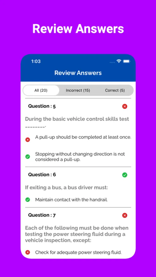 Our app includes a variety of practice questions for the Driver's license exam for Commercial Vehicles. These questions are based on the official handbook of different states.