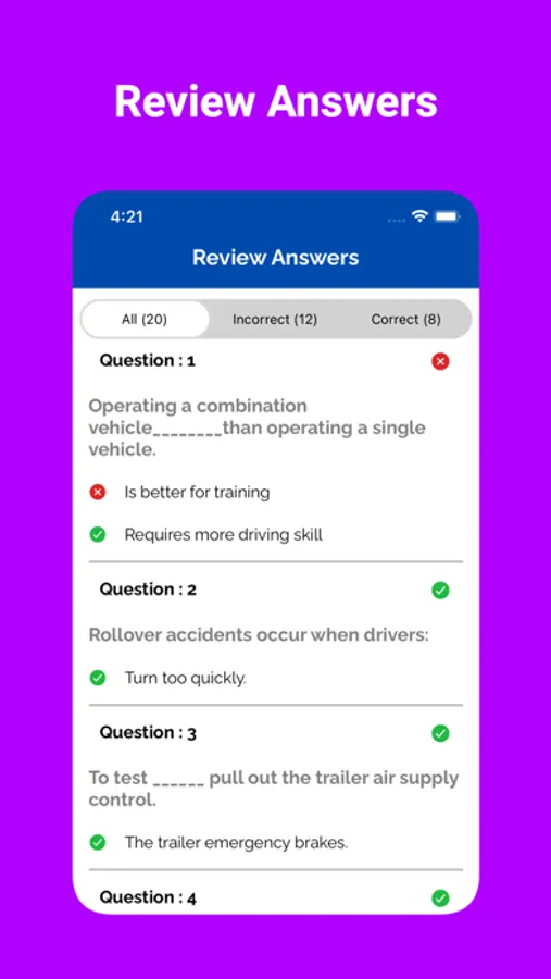 Our app includes a variety of practice questions for the Driver's license exam for Commercial Vehicles. These questions are based on the official handbook of different states.