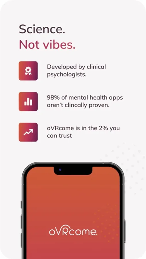 oVRcome has been developed in a clinical setting, backed by a robust body of academically accepted, evidence based, peer reviewed literature. It encapsulates the inner workings of psychological theory and proven methodology, delivered in a user friendly, intuitive, and calming package. Best of all, oVRcome is immediately accessible through the convenience, familiarity, and simplicity of your smartphone.