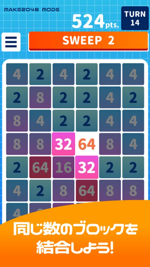 ・ブロックを結合すると、数に応じて数字が大きくなります。目指せ「2048」!