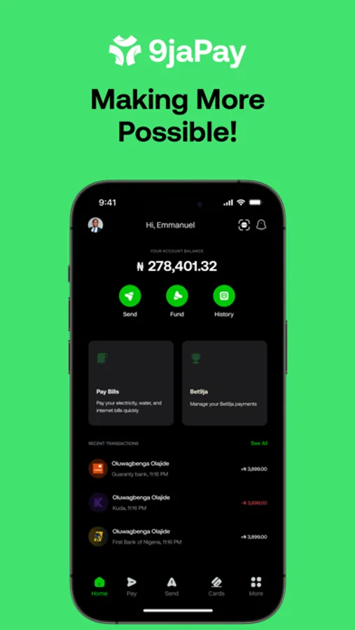 Start Transacting - Whether you need to send money to loved ones, schedule a transfer, or move money quickly, 9jaPay has you covered. Experience financial convenience like never before.