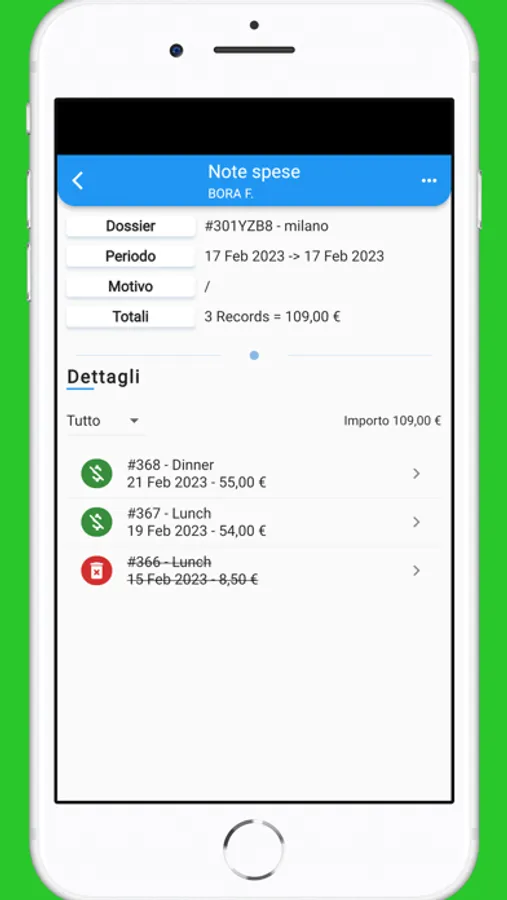- Tipologia (Anticipo - Pranzo - Cena - Taxi - Parcheggio - Carburante - Autostrada - Bar - Hotel - Varie)
