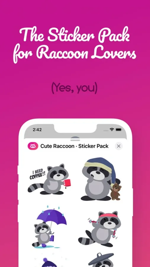 Cute Raccoon · Sticker Pack was designed and produced by and for real Raccoon Lovers. It is not a secret that there’s a whole community out there that adores these little sweet animals, so it was time we had some way of expressing ourselves and shouting to the world: “Yes, I’m a huge raccoon fan!”. And what better way of doing that than helping the animals we care for and love in the process? You heard it right, with every download you’re helping a little raccoon get on with whatever situation is having to live, ‘cause 10% of each purchase is donated to raccoon-helping Organizations.