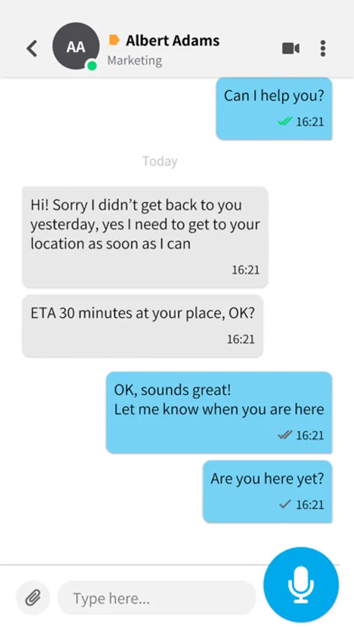 • Organizational Chat - texting, splash messages, voice and video recording in a secured organizational environment.