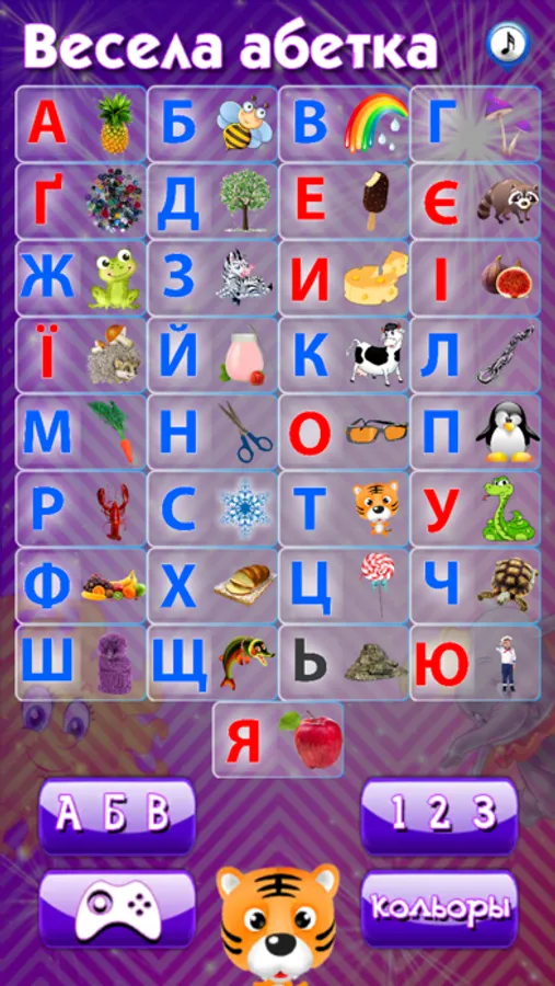 - Яскраві зображення для кожної літери;