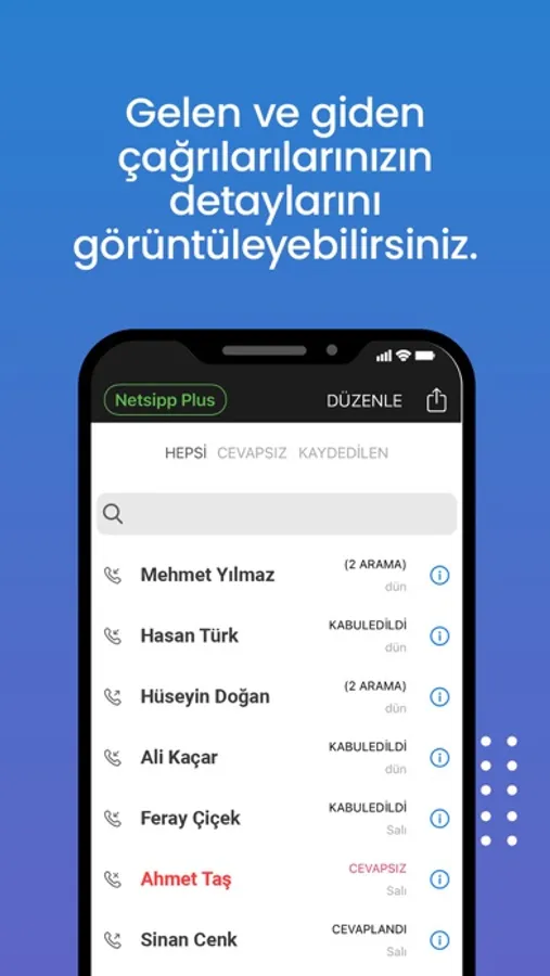 • Arama geçmişinde mevcut telefon ve Netsipp+ çağrılarının gösterimi.(Gelen, giden, cevapsız, meşgul çağrılar)