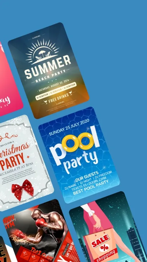 Create new posters for social media and festivals. You can easily create custom posters like advertisement banners, festival posters, cover photos for your own business, and also flyer designer.